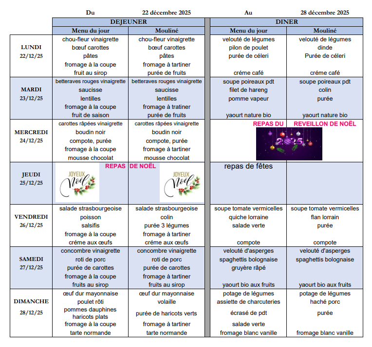 Menu du 22 Décembre au 28 Décembre 2025