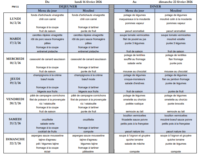 Menu du 16 au 22 Février 2026