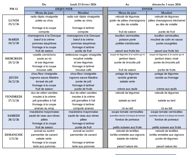 Menu du 16 au 22 Février 2026
